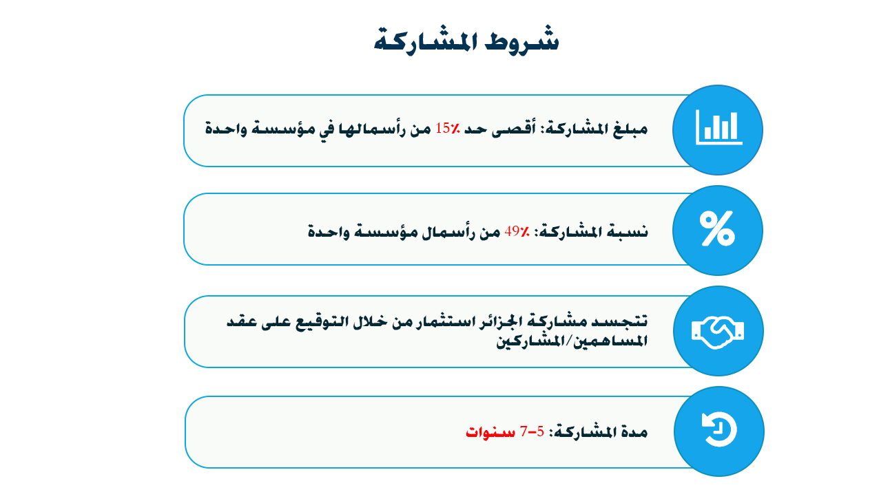 المشاركة في رأسمال لا تستوجب أي ضمانات. تستند مكافأة الشركة المستثمرة على الأرباح والمكاسب المالية المحتملة عند خروجها